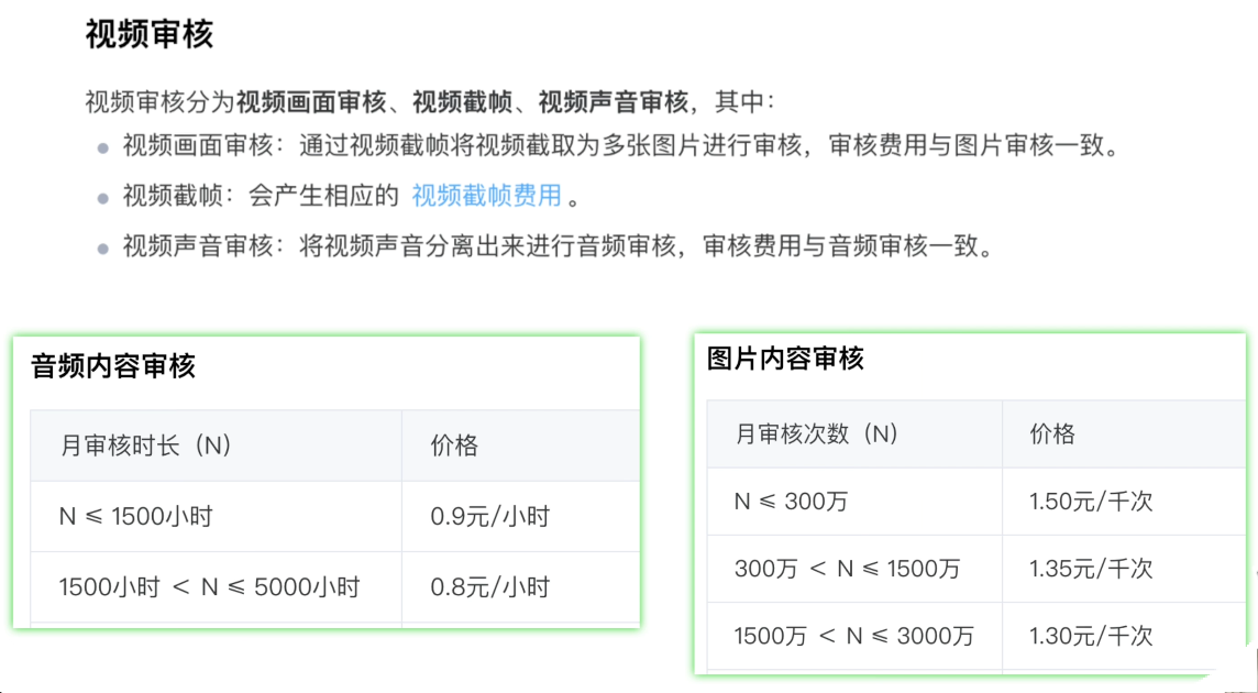 鱼皮:可以用内容审核服务。视频审核包含画面和声音两部分,比文字审核更贵,审核 1000 小时视频,大概几千块。