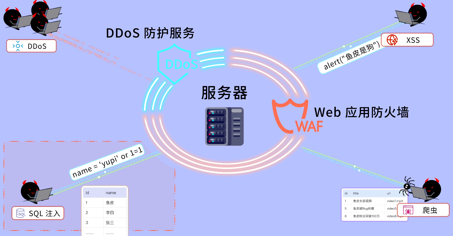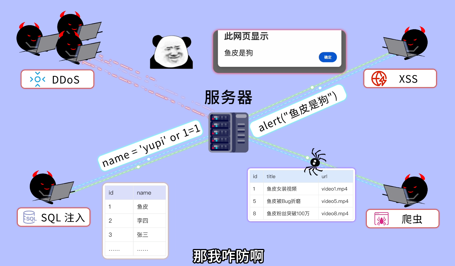 鱼皮:第二个是最最最难应对的 网络攻击。做视频网站,尤其是有付费内容的,特别容易被攻击。DDoS 流量攻击想把你冲垮、SQL 注入想偷你数据、XSS 攻击想搞你用户、爬虫想盗你视频……