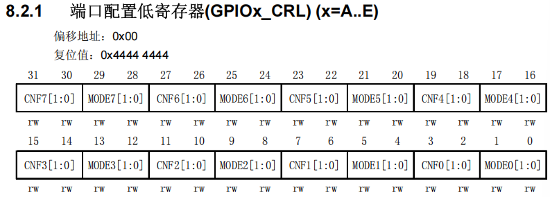 - STM32中每一寄存器为32位,所以需要两个寄存器来配置一个GPIOx:端口配置低寄存器(GPIOx_CRL)和端口配置高寄存器(GPIOx_CRH)