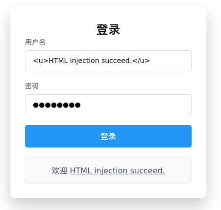 在用户名输入框中输入:<u>HTML injection succeed.</u>。如果其余字段满足验证逻辑,HTML injection succeed.会被回显到页面,并且以下划线的形式展示。如图14所示: