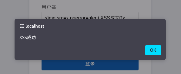 在用户名输入框内注入<img src=x onerror=alert('XSS成功')>,并在密码框输入任意值提交。由于系统未对用户输入内容进行过滤或编码处理,该段代码被直接回显至页面中。当浏览器尝试加载不存在的图片x时,触发onerror事件,进而执行其中所包含的JavaScript代码,弹出警告框。