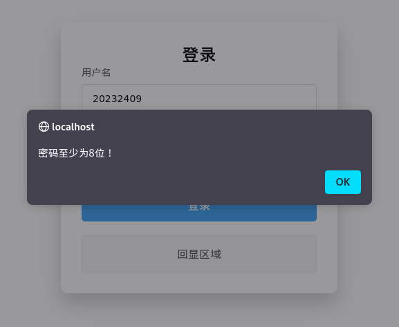 当用户点击登录按钮后,程序会检查用户的输入是否满足要求。如果用户名或口令为空,则在对应位置给出错误提示;若口令长度不满足,则弹出弹框给出错误信息;若所有条件均满足,则回显用户登录信息。该部分的js代码如图10所示,运行情况如图11-13所示: