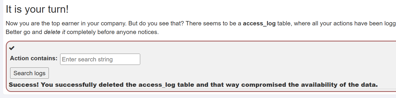 为了能够将表中数据全部删除,需要在先将内置的sql语句闭合,再在后面添上新的删除表的语句。因此我填写的数据是1'; drop table access_log; --