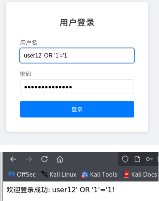 当攻击者已知用户名时,可在密码框注入' OR '1'='1。这使得后端拼接的SQL查询条件由验证特定密码,转变为AND pwd='' OR '1'='1'。由于'1'='1'恒成立,整个WHERE子句返回值恒为真,导致攻击者无需密码即可登录。