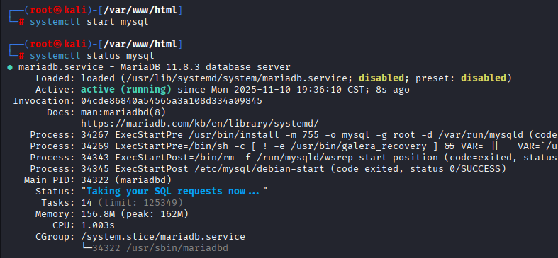 使用命令systemctl start mysql启动kali虚拟机自带的MySQL,通过命令systemctl status mysql可查看服务的启用情况。如图16所示。