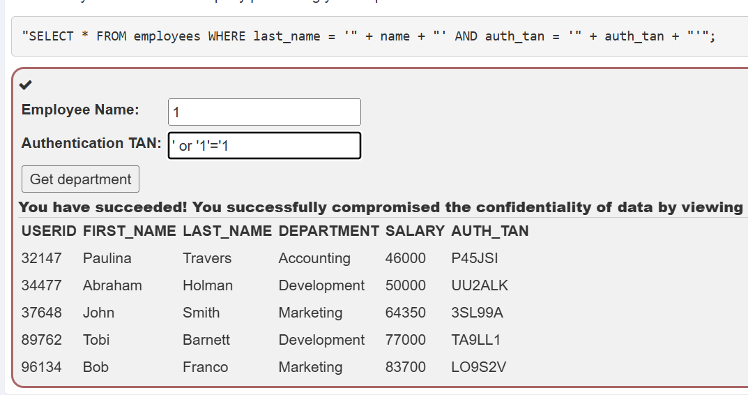 该部分给出的语句为:"SELECT * FROM employees WHERE last_name = '" + name + "' AND auth_tan = '" + auth_tan + "'";