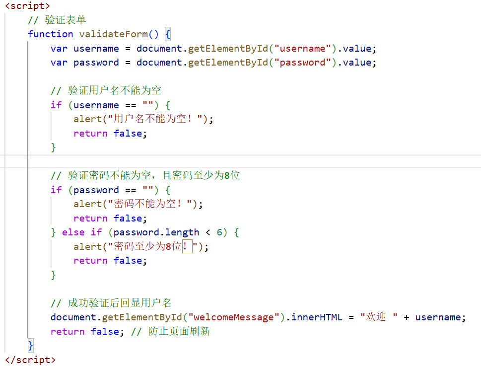 静态的HTML本身无法实现复杂的验证逻辑,为实现“用户名与密码非空”及“密码长度不低于8位”的验证要求,此处使用JavaScript实现基本的验证逻辑。它能够在数据发送到服务器前,通过DOM API获取输入值并进行逻辑判断,从而提供即时反馈。