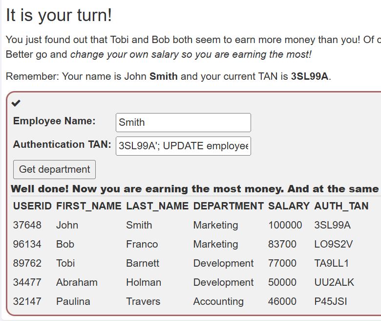 TAN:3SL99A'; UPDATE employees SET SALARY = 100000 WHERE LAST_NAME = 'Smith