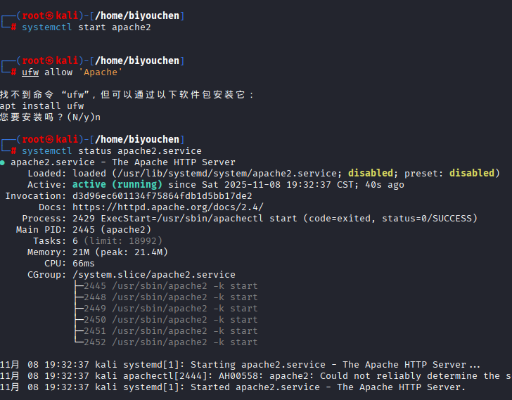 使用命令systemctl start apache2可启动Kali虚拟机中自带的Apache服务,命令systemctl status apache2.service可确认Apache状态,命令systemctl stop apache2可关闭Apache服务。