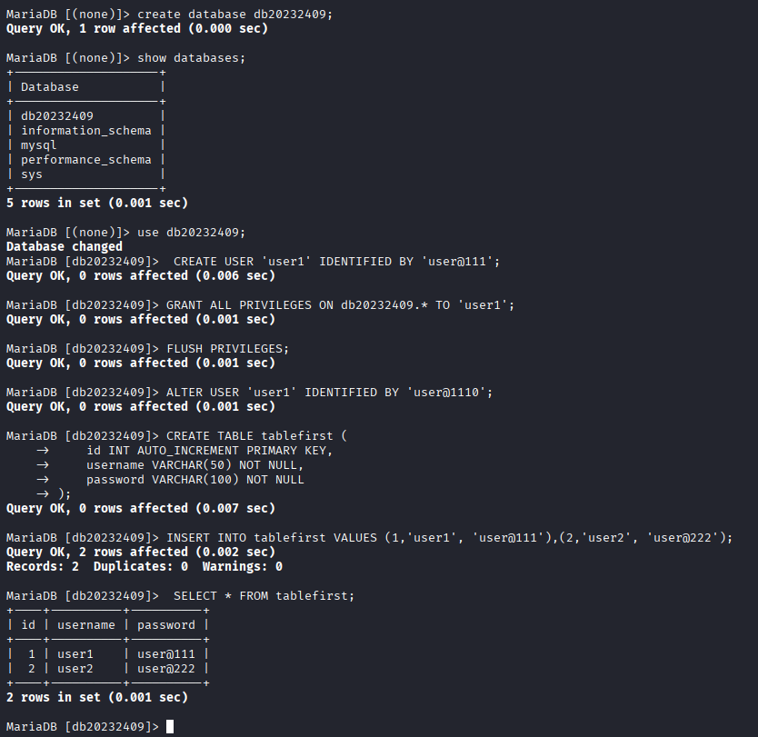 CREATE DATABASE db20232409; #创建数据库USE user1; 进入数据库CREATE USER 'user1' IDENTIFIED BY 'user@111'; #创建用户GRANT ALL PRIVILEGES ON db20232409.* TO 'user1'; #授予用户所有权限FLUSH PRIVILEGES; #刷新权限ALTER USER 'user1' IDENTIFIED BY 'user@1110'; #修改用户密码CREATE TABLE tablefirst (id INT AUTO_INCREMENT PRIMARY KEY,username VARCHAR(50) NOT NULL,password VARCHAR(100) NOT NULL); #创建表INSERT INTO tablefirst VALUES (1,'user1', 'user@111'),(2,'user2', 'user@222'); #插入数据SELECT * FROM tablefirst; #查看表中所有内容