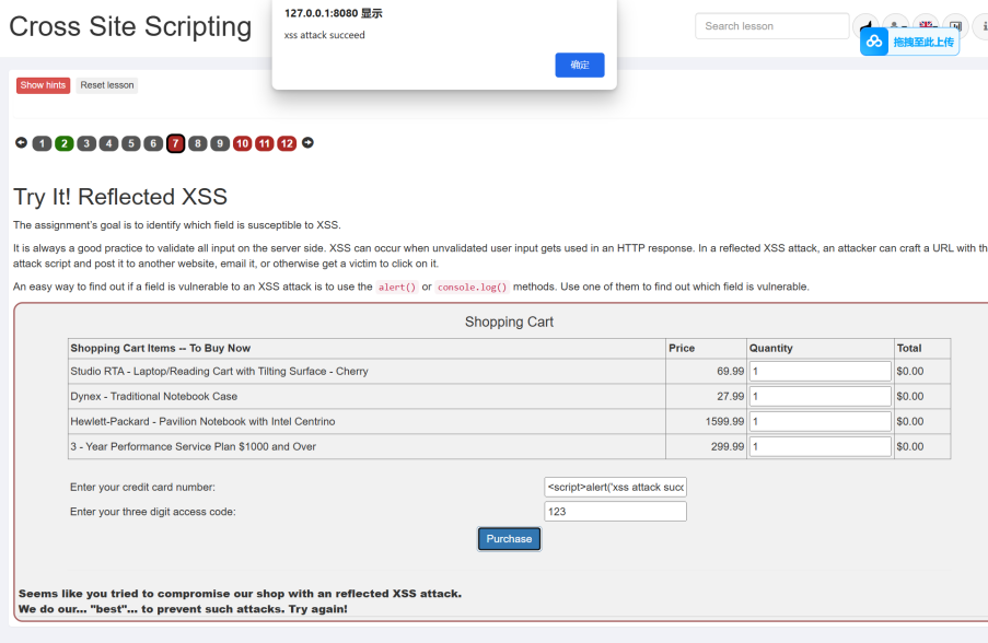 依次尝试在两个输入框中输入JavaScript注入信息<script>alert('xss attack succeed')</script>。发现仅在第一个框中输入时可以成功,可能是因为第一个框需要的是字符型参数,第二个框中需要的是数值型参数。