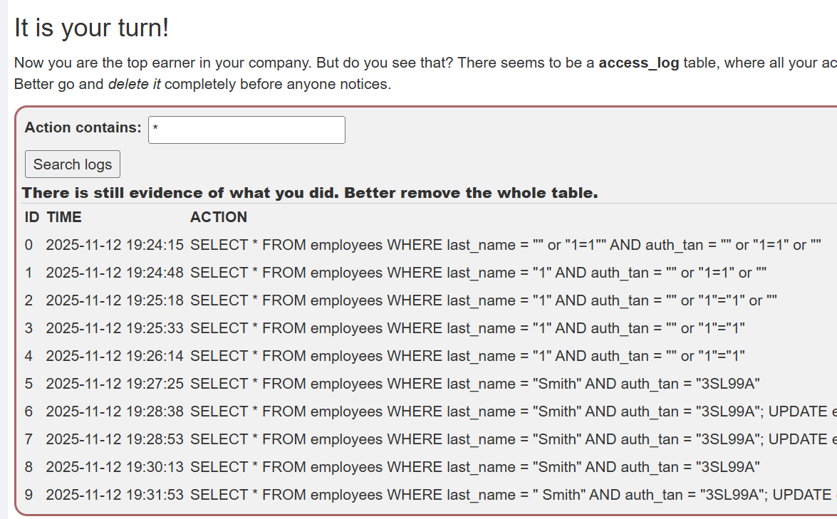 该部分为填空题,需要填写name和auth_tan。为了能够查出表中的所有数据,所以需要在其中的一个空内设置一个永真条件。我选择在name中填入任意值,在auth_tan里闭合引号后再跟上字符型的永真条件。