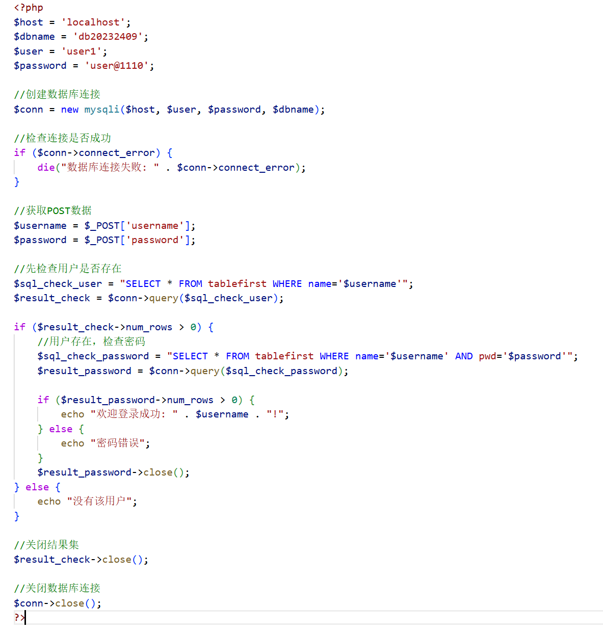 仔细检查PHP代码后,我发现出现问题的原因是前后端字段没对齐。前端登录表单中使用的字段名是username和password,而后端PHP代码中却试图获取name和pwd这两个字段。它导致后端无法正确接收到前端提交的数据,从而无法进行有效的数据库查询和验证。当修改前后端字段对齐后,该问题得以解决。