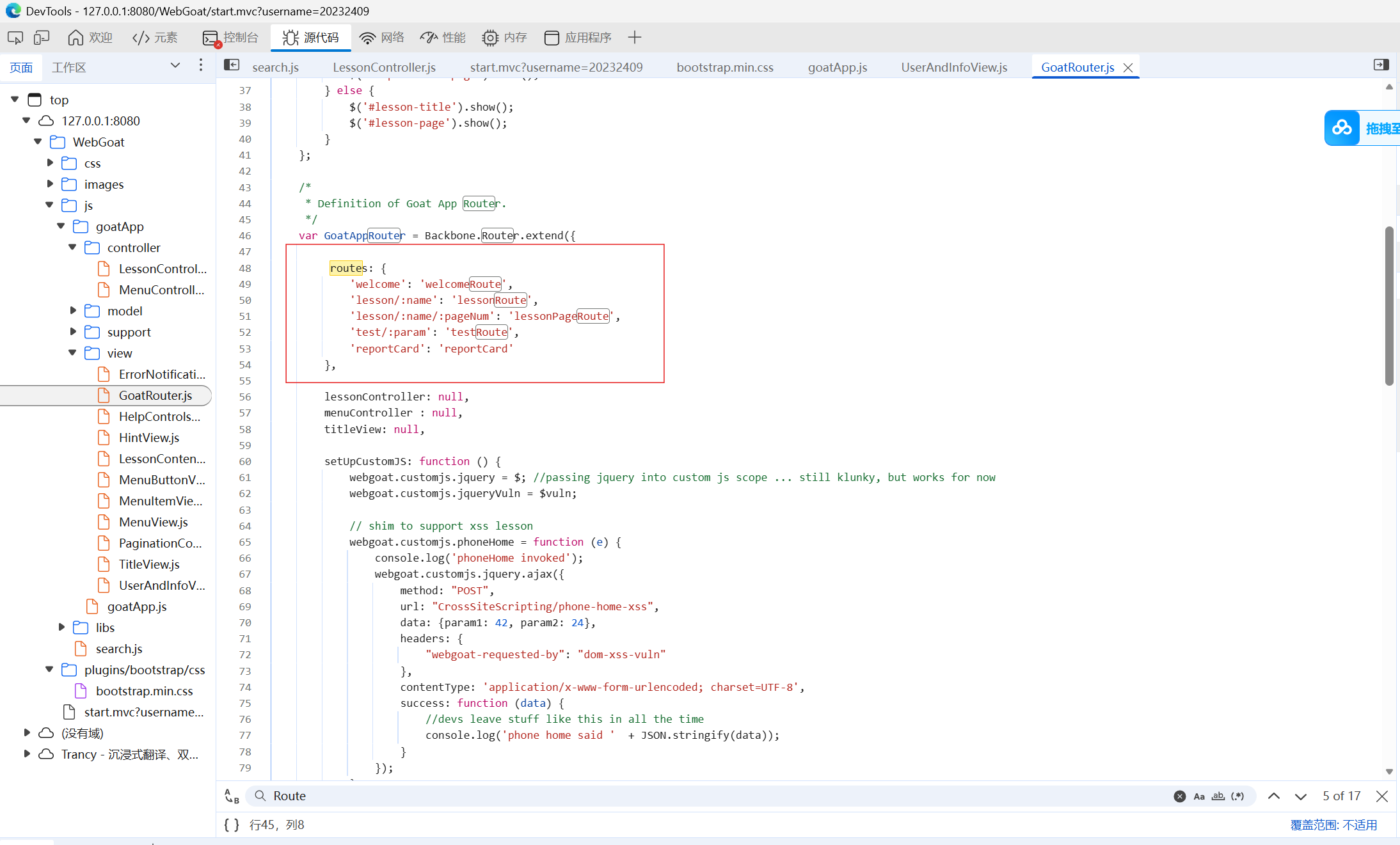 右键点击检查,查找源代码。遍历查找所有以.js结尾的文件,全局搜索route,发现在GoatRouter.js文件中出现了路由信息。其中有记录: