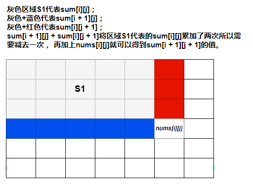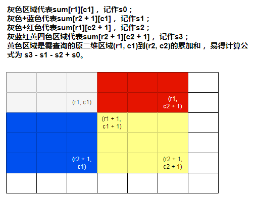 class NumMatrix {private int[][] sum;public NumMatrix(int[][] matrix) {int m = matrix.length, n = matrix[0].length;sum = new int[m + 1][n + 1];for (int i = 0; i < m; i++) {for (int j = 0; j < n; j++) {sum[i + 1][j + 1] = matrix[i][j] + sum[i][j + 1] + sum[i + 1][j] - sum[i][j];}}}public int sumRegion(int row1, int col1, int row2, int col2) {return sum[row2 + 1][col2 + 1] - sum[row2 + 1][col1] - sum[row1][col2 + 1] + sum[row1][col1];}