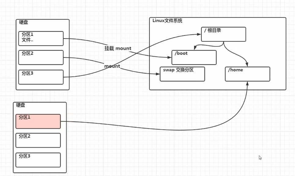 Linux 无论有几个分区,分给哪一目录使用,它归根结底就只有一个根目录,一个独立且唯一的文件结构 , Linux中每个分区都是用来组成整个文件系统的一部分。Linux 采用“挂载”的处理方法,它将一个分区和一个目录联系起来。要使用分区的存储空间就可以在目录下获得。
