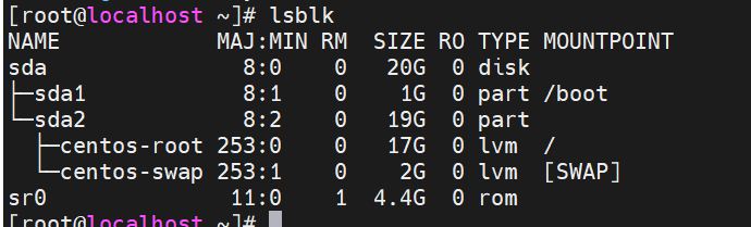 [root@localhost ~]# lsblk NAME MAJ:MIN RM SIZE RO TYPE MOUNTPOINT sda 8:0 0 20G 0 disk ├─sda1 8:1 0 1G 0 part /boot └─sda2 8:2 0 19G 0 part├─centos-root 253:0 0 17G 0 lvm /└─centos-swap 253:1 0 2G 0 lvm [SWAP] sr0 11:0 1 4.4G 0 rom [root@localhost ~]# lsblk -f NAME FSTYPE LABEL UUID MOUNTPOINT sda ├─sda1 xfs 706b1b29-efd9-4e29-a9dd-b9c439e3473e /boot └─sda2 LVM2_member YV1pdX-138A-PFDQ-0X06-fOmZ-tMhu-6iZclw├─centos-root xfs dd94dc04-1275-41a3-9ac6-f2e1b901b378 /└─centos-swap swap 5dd66c5f-3af1-4345-9731-3c472a0661f1 [SWAP] sr0 iso9660 CentOS 7 x86_64 2020-11-04-11-36-43-00