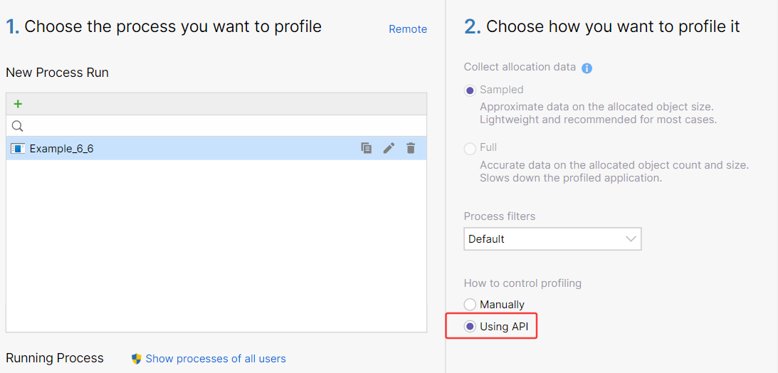 代码里埋好点之后,接下来打开 dotmemory,使用 Using API 模式,这样就相当于给程序开了一个口子,截图如下: