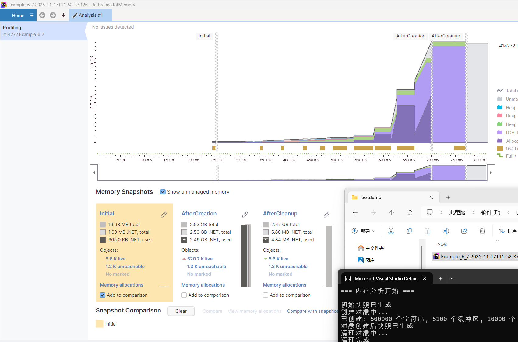 internal class Program{static void Main(string[] args){DotMemory.Init();var config = new DotMemory.Config();config.SaveToDir(@"E:\testdump");DotMemory.Attach(config);Console.WriteLine("=== 内存分析开始 ===\n");var memoryDemo = new MemoryDemo();DotMemory.GetSnapshot("Initial");Console.WriteLine("初始快照已生成");memoryDemo.CreateObjects();DotMemory.GetSnapshot("AfterCreation");Console.WriteLine("对象创建后快照已生成");memoryDemo.Cleanup();DotMemory.GetSnapshot("AfterCleanup");Console.WriteLine("清理后快照已生成");Console.WriteLine("\n=== 分析完成 ===");DotMemory.Detach();}}public class MemoryDemo{private List<string> _strings = new();private List<byte[]> _buffers = new();private List<char[]> _charArrays = new();public void CreateObjects(){Console.WriteLine("创建对象中...");for (int i = 0; i < 500000; i++){_strings.Add($"Data_{i}_{Guid.NewGuid()}_AdditionalPaddingDataToMakeStringLarger");}for (int i = 0; i < 5000; i++){_buffers.Add(new byte[1024 * 200]);}for (int i = 0; i < 100; i++){_buffers.Add(new byte[1024 * 1024 * 5]);}for (int i = 0; i < 10000; i++){_charArrays.Add(new char[1024 * 50]);}Console.WriteLine($"已创建: {_strings.Count} 个字符串, {_buffers.Count} 个缓冲区, {_charArrays.Count} 个字符数组");}public void Cleanup(){Console.WriteLine("清理对象中...");_strings.Clear();_buffers.Clear();_charArrays.Clear();GCSettings.LargeObjectHeapCompactionMode = GCLargeObjectHeapCompactionMode.CompactOnce;GC.Collect(2, GCCollectionMode.Forced, true, true);GC.WaitForPendingFinalizers();Console.WriteLine("清理完成");}}