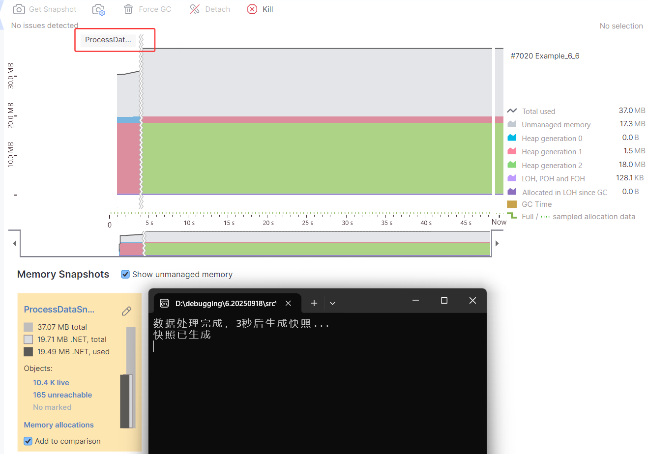 internal class Program{static void Main(){var analyzer = new MemoryAnalyzer();analyzer.ProcessData();Console.ReadLine();}}public class MemoryAnalyzer{private readonly List<string> _data = new();public void ProcessData(){// 模拟内存密集型操作for (int i = 0; i < 10000; i++){_data.Add(new string('x', 1000));}Console.WriteLine("数据处理完成,3秒后生成快照...");Thread.Sleep(3000);MemoryProfiler.GetSnapshot("ProcessDataSnapshot");Console.WriteLine("快照已生成");}}