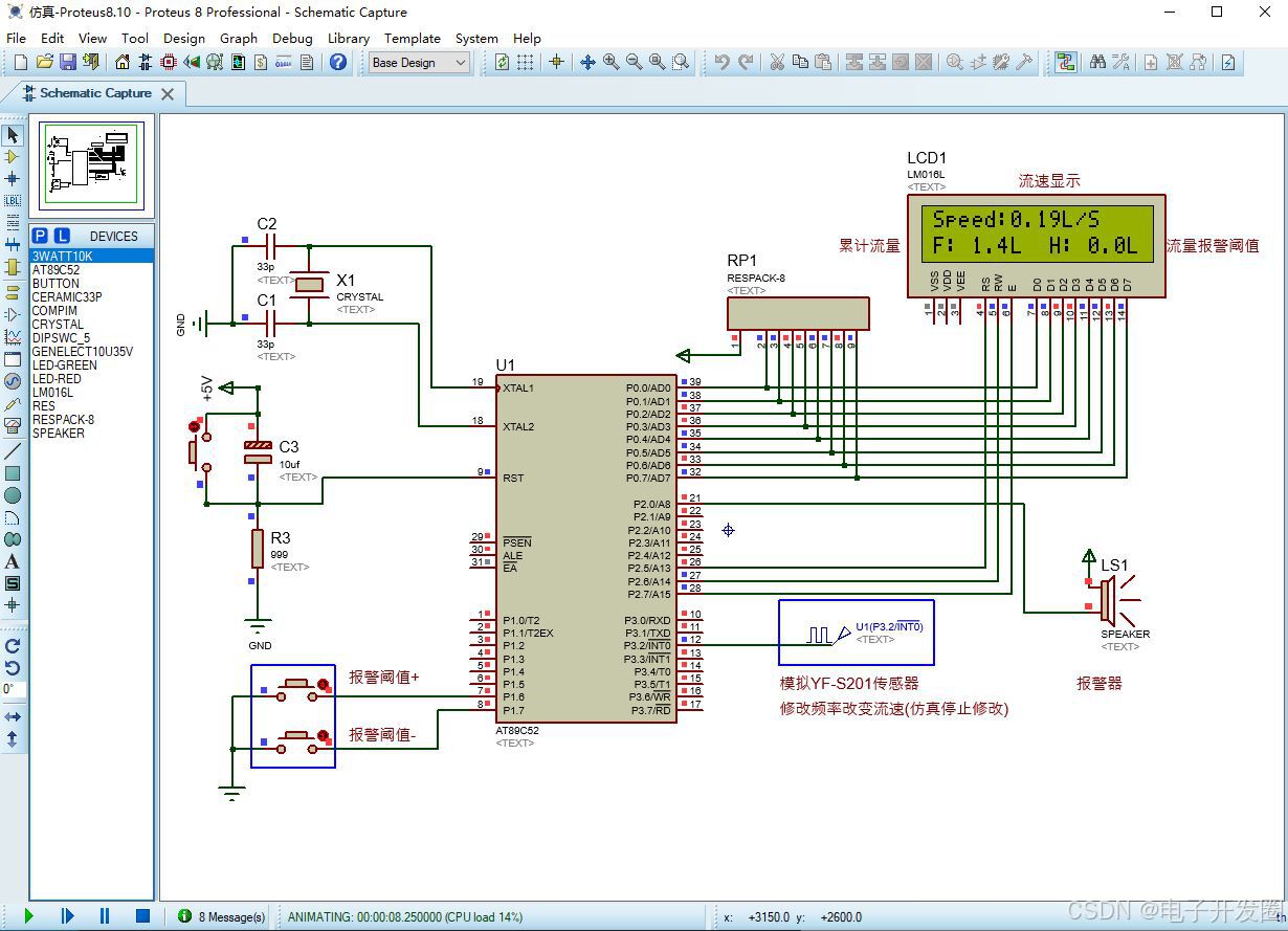 仿真平台选择Proteus软件,该软件能够模拟单片机系统和各种外围电路,支持代码调试和电路分析。在Proteus中搭建系统仿真模型,包括STC89C52单片机、YF-S201流量传感器、LCD1602显示屏、蜂鸣器、按键等元件。