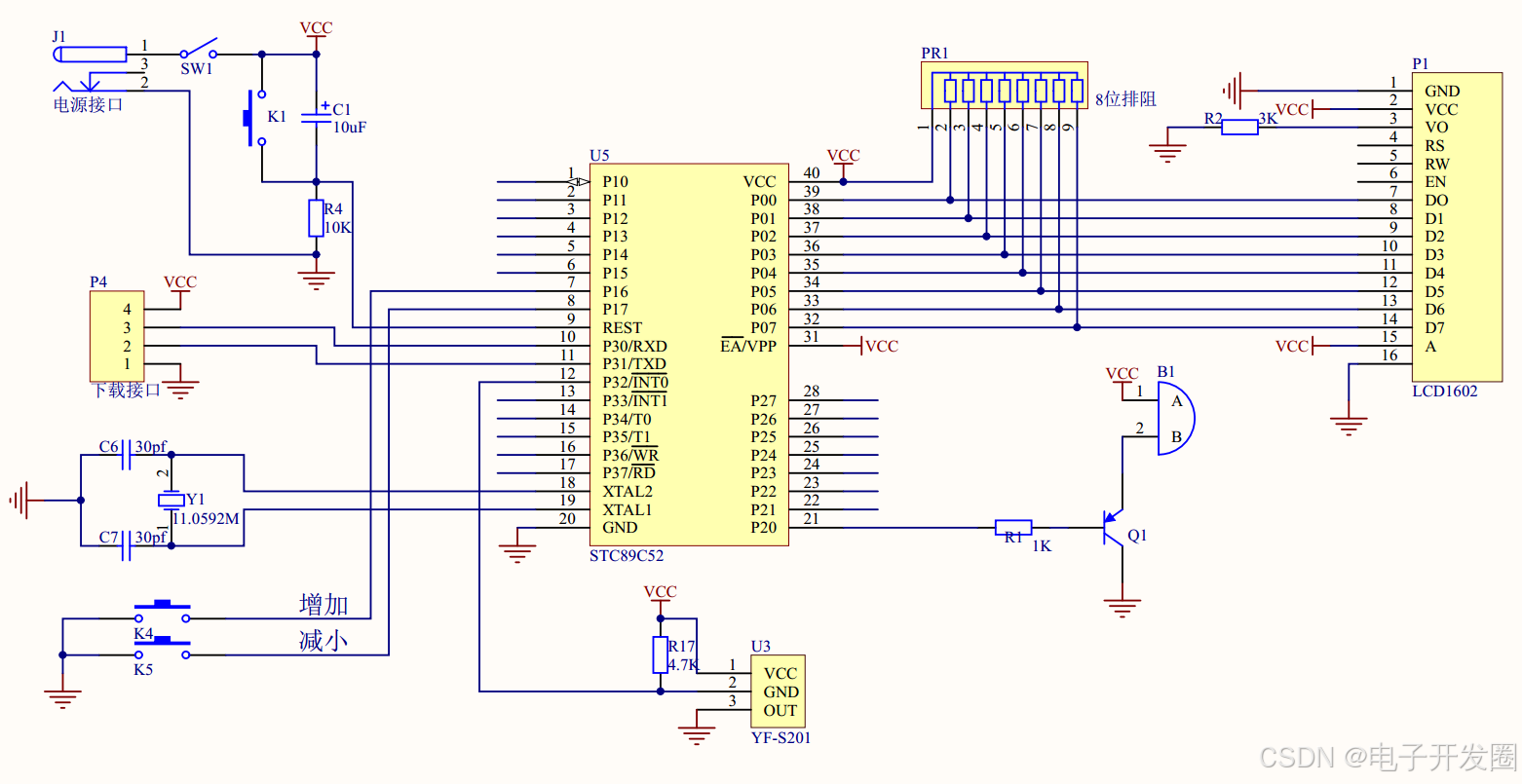 一款8位单片机,具有8KB Flash程序存储器、512B RAM和32个I/O口,能够满足本体系的控制需求。晶振电路采用11.0592MHz晶振,为系统供应稳定的时钟信号。复位电路采用手动复位和上电复位相结合的方式,确保系统可靠启动。电源电路给予5V直流电压,为整个系统供电。就是单片机最小体系设计包括STC89C52芯片、晶振电路、复位电路和电源电路。STC89C52