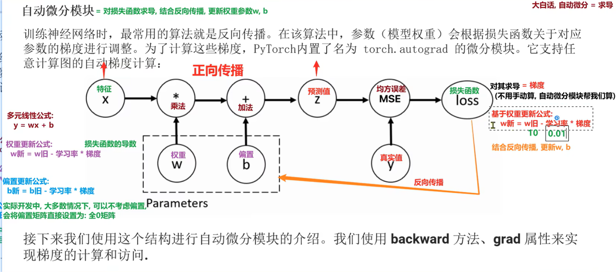 1. 自动微分模块=对损失函数求导,结合反向传播,更新权重参数w,b
