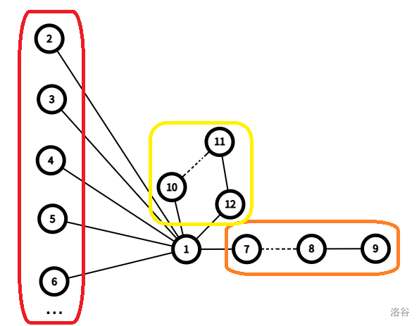 - 黄色部分,仅通过前面两个部分我们可能无法将 \(n\) 个点全部用完,所以我们可以通过构造一个环来将剩下的点用完。