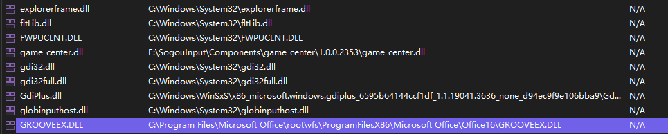 通过模块窗口可见 GROOVEEX.DLL 的路径是: C:\Program Files\Microsoft Office\root\vfs\ProgramFilesX86\Microsoft Office\Office16\GROOVEEX.DLL