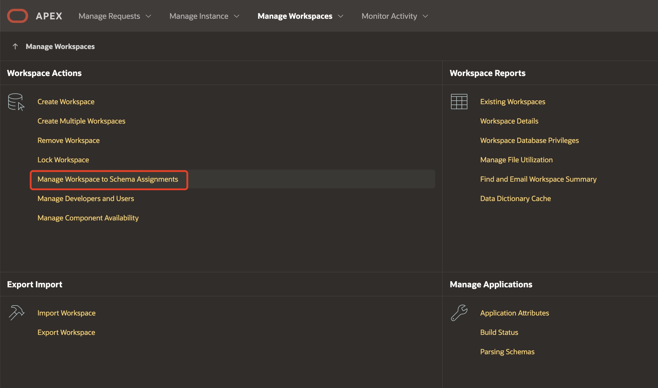 进入internal的workspace之后,按下图选择 Manage Workspaces -> Manage Workspace to Schema Assignments :