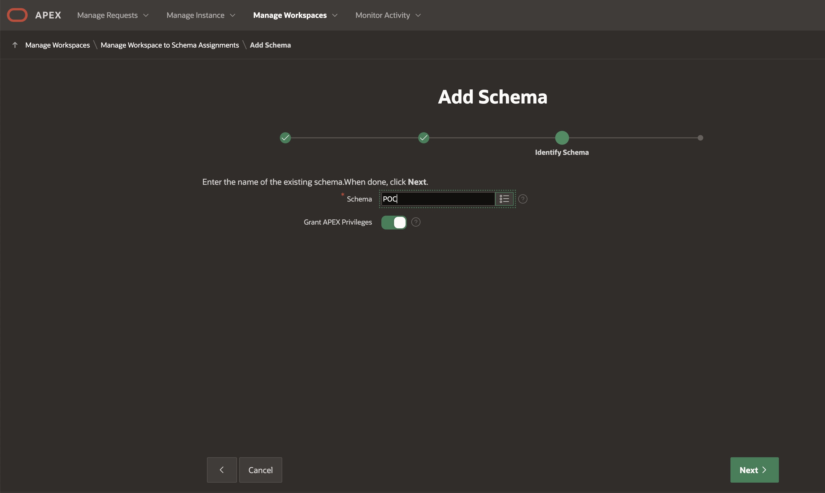 如果想让 APEX 访问业务数据(例如用户 POC),就必须手动给 Workspace 映射 Schema。