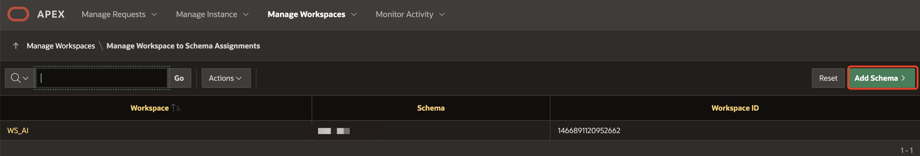 这里笔者演示为WS_AI这个workspace添加其他Schema,按下图所示,点击 Add Schema :
