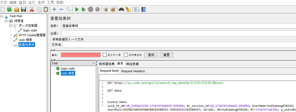 从上图中可以看到,HTTP请求取样器在发起对CSDN的搜索请求时,已经自动携带了登录后的Cookie数据了。