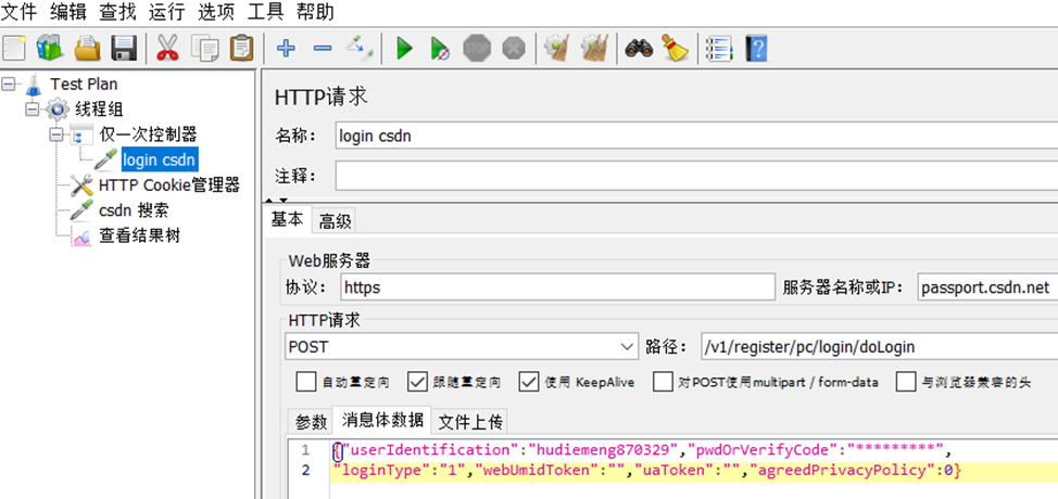 - HTTP请求取样器:由于CSDN博客网站是通过https协议在浏览器中进行访问,所以需要使用Jmeter中的HTTP请求取样器来模拟登录请求和关键字的搜索请求。