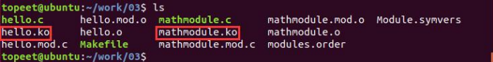 编译完后会生成 hello.ko 和 mathmodule.ko 目标文件,如图 5.3 所示: