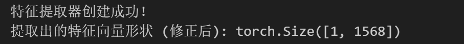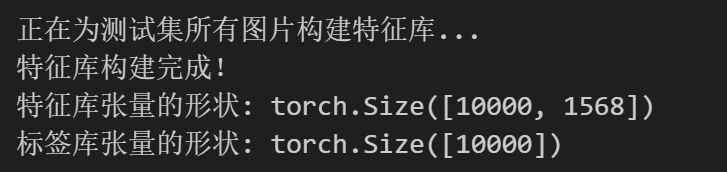 输出验证:代码运行结束后,会打印出这个特征库的形状。例如 torch.Size([10000, 1568]),这表示我们的测试集里有10000张图片,每张图片都对应一个1568维的特征向量。至此,搜索引擎的“后端数据库”已经准备就绪!