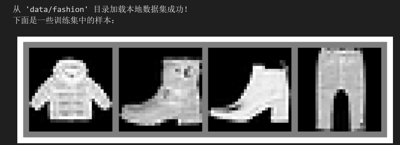实例化与使用:最后,我们像使用官方数据集一样,简单地创建LocalFashionMNIST的实例,并把它传递给DataLoader。整个下游的可视化流程完全不用改变! 通过这个方法,我们实现了对数据加载流程的完全掌控,无论数据存放在什么奇特的路径下,我们都能轻松应对。