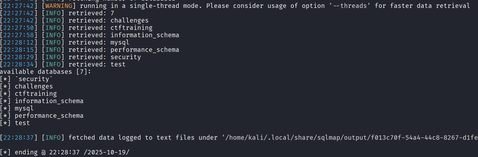 --time-sec=10:设置时间盲注的延迟阈值为 10 秒(即注入语句若使服务器延迟 10 秒以上,则判定为有效)。