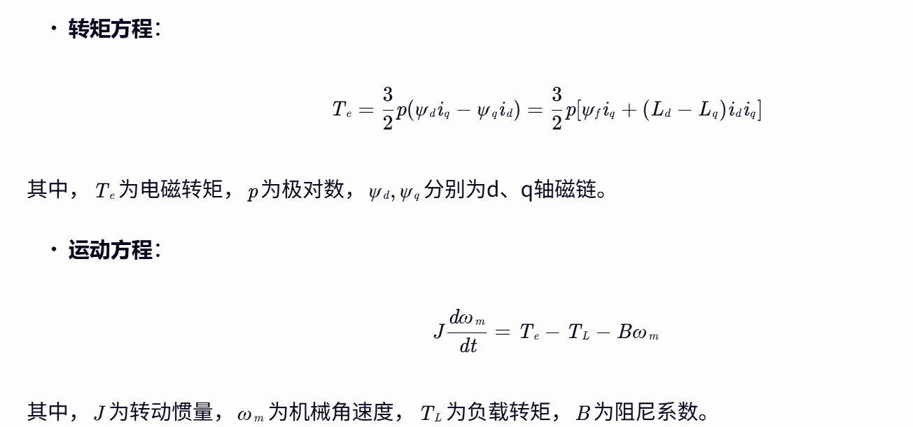 1. 首先,编写永磁同步电机的动态方程。这可能是基于电机的物理特性和转子、定子之间的电磁耦合关系建立的微分方程组。