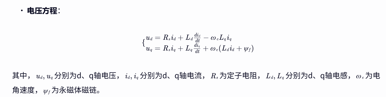 PMSM在矢量控制中常采用d - q旋转坐标系模型,假设忽略磁滞、涡流损耗和阻尼绕组,其动态方程如下: