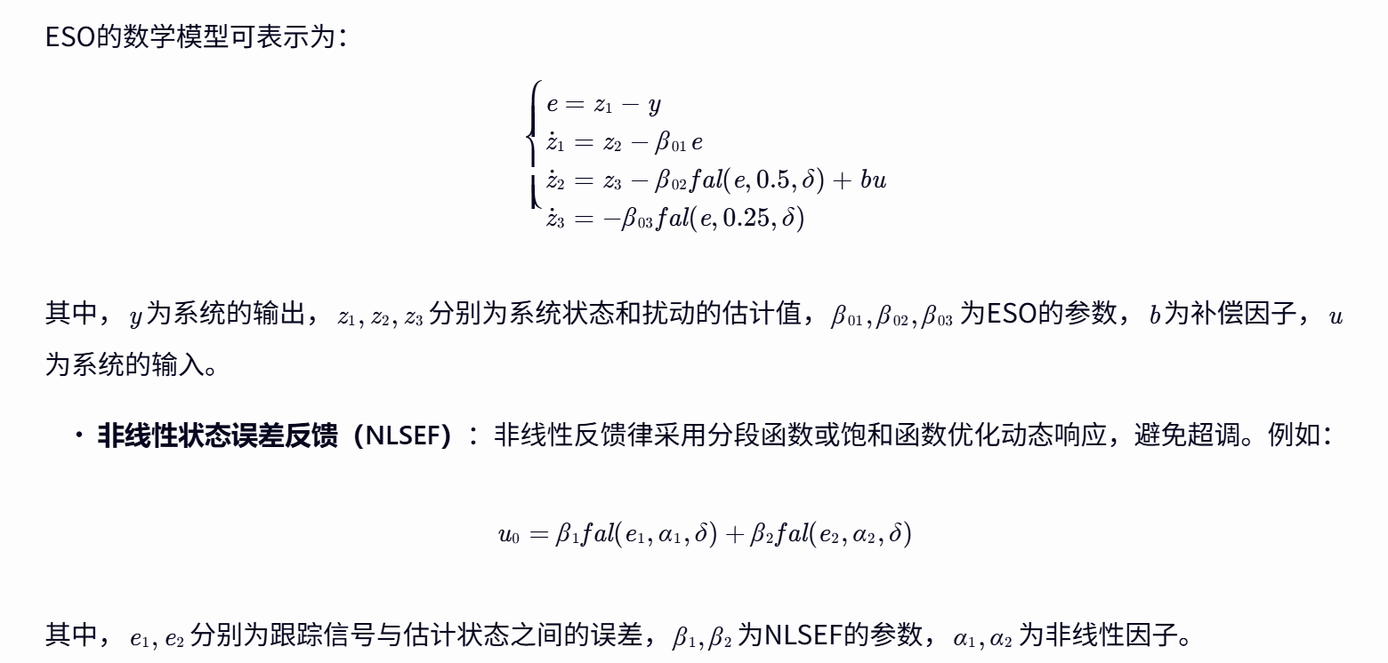 - 非线性状态误差反馈(NLSEF):基于TD和ESO的输出设计非线性控制律,将跟踪信号与估计状态之间的误差进行非线性组合得到初级控制量,然后同总扰动的补偿量一起生成最终的控制信号。NLSEF采用非线性函数,能够提高系统的动态响应速度和抗干扰能力。