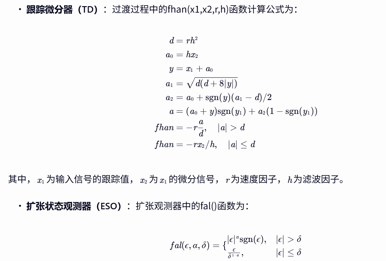 - 跟踪微分器(TD):用于安排合适的过渡过程,抑制输入信号突变引起的振荡,并提供微分信号。其作用是使环境能够快速且平稳地跟踪输入信号,避免因输入信号的突变导致系统出现超调或振荡。