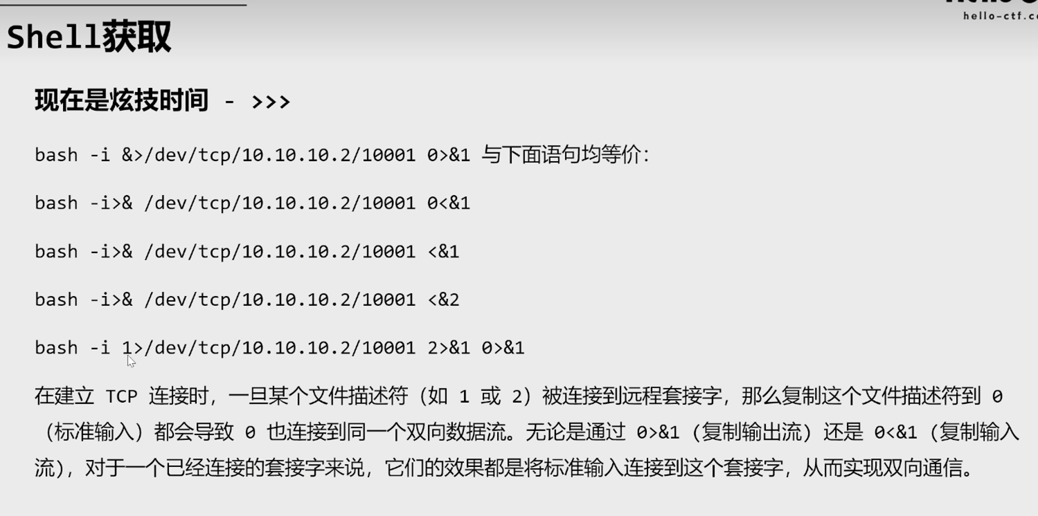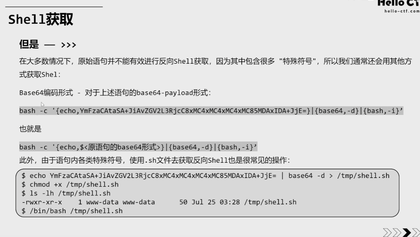 当然有的时候系统可能会对输入进行过滤,我们就需要变换一下命令的格式,探姬老师这个图片里面说到了base64编码,还有将反弹shell的命令写入sh文件里面作为脚本给予执行权限后再运行